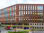 Ассиметричная форма зданий отлично сочетается с клинкерным кирпичом и высокими витринными окнами.