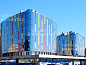 Офисные центры смотрятся эффектно благодаря полностью стеклянному фасаду и акцентным красным и желтым вставкам.